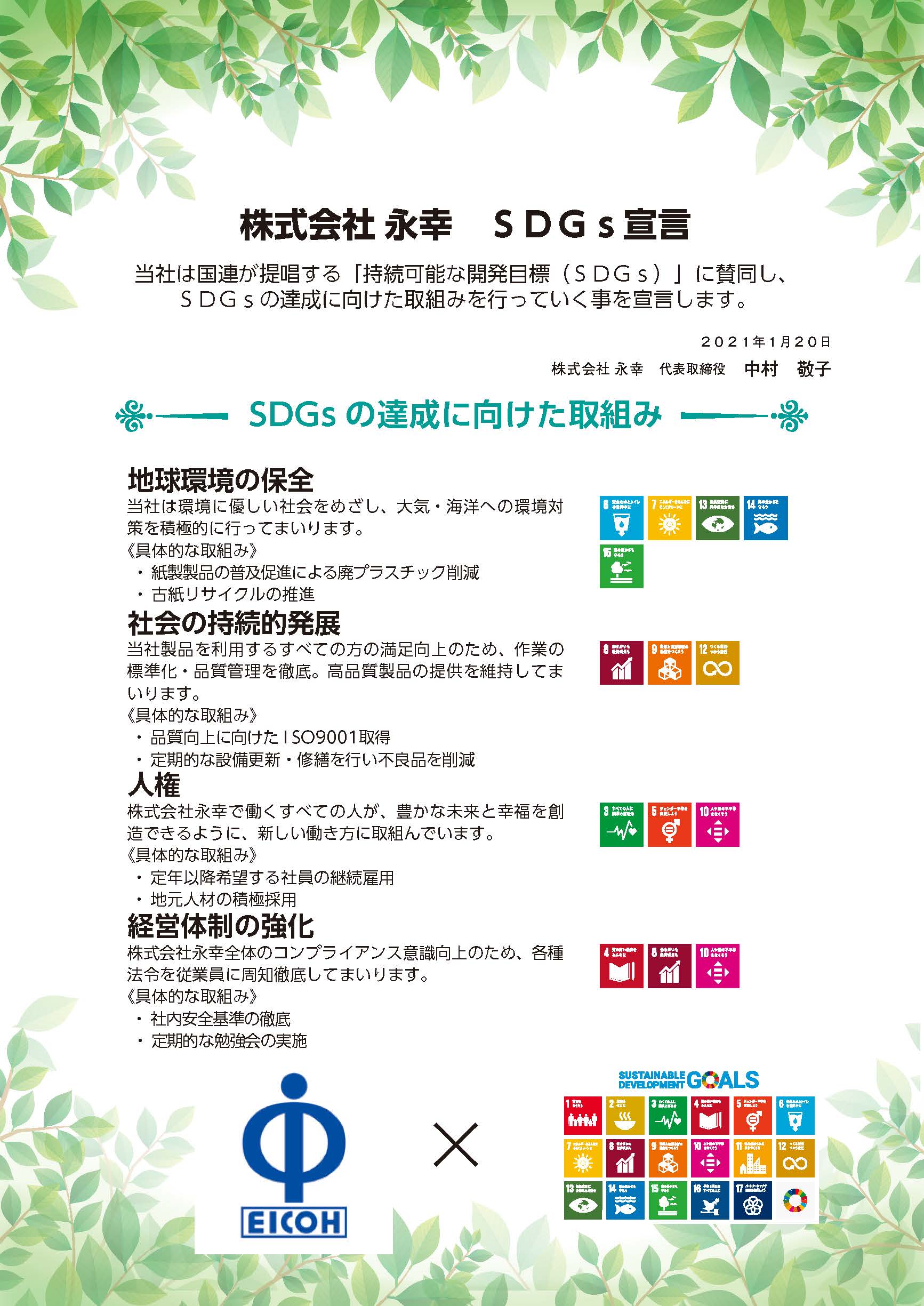 株式会社永幸(以下当社)は、「自然と人間が調和し、豊かで快適な環境と社会に貢献する企業を目指す」の企業理念のもと社会の持続可能な発展に貢献します。